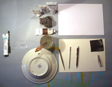 Gli strumenti: carta vetrata, ramina, nastro adesivo, lacca per capelli, carta assorbente, acrilico, olio, punte da incisione e ovviamente matita e pennelli…