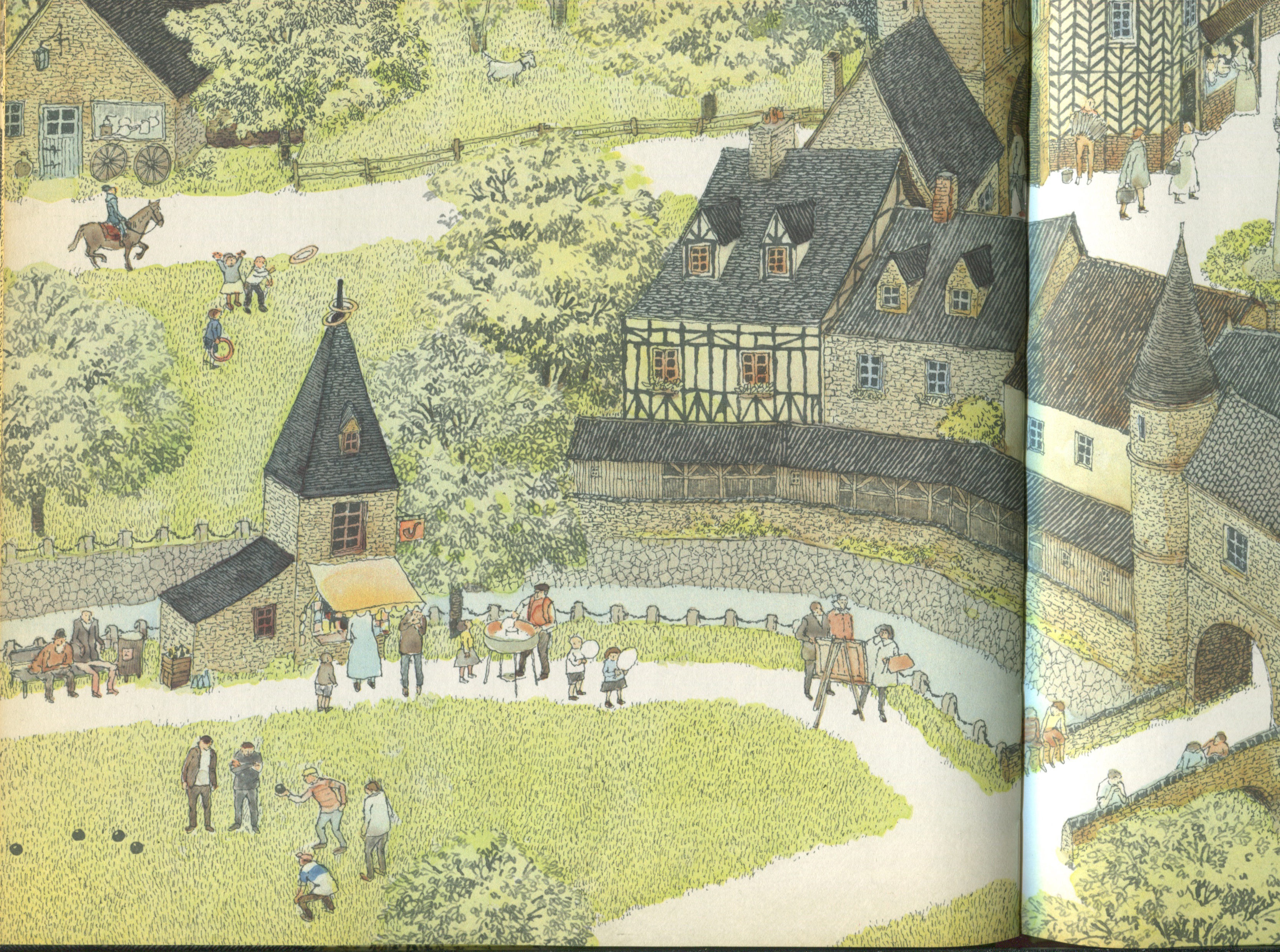 E riguardandolo, a onor di cronaca, non è in questo libro che si trovano le tavole leggibili anche capovolte, forse sono in “Topsy Turvies” che in Italia non è stato tradotto, ma in internet ho trovato una immagine intitolata “village” che è esattamente quello che ricordavo, leggibile sotto e sopra…bene, ho detto tutto, tanti auguri per il tuo lavoro!