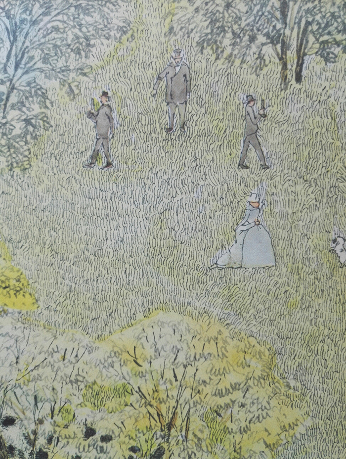 Scopro ancora, in alto, tra l’erba e un po’ nascosto dagli alberi, un innamorato che sta offrendo dei fiori a una ragazza. Lui è in una posizione leggermente plateale, lei tiene le spalle rigide, forse non crede del tutto alla dichiarazione che le viene fatta.