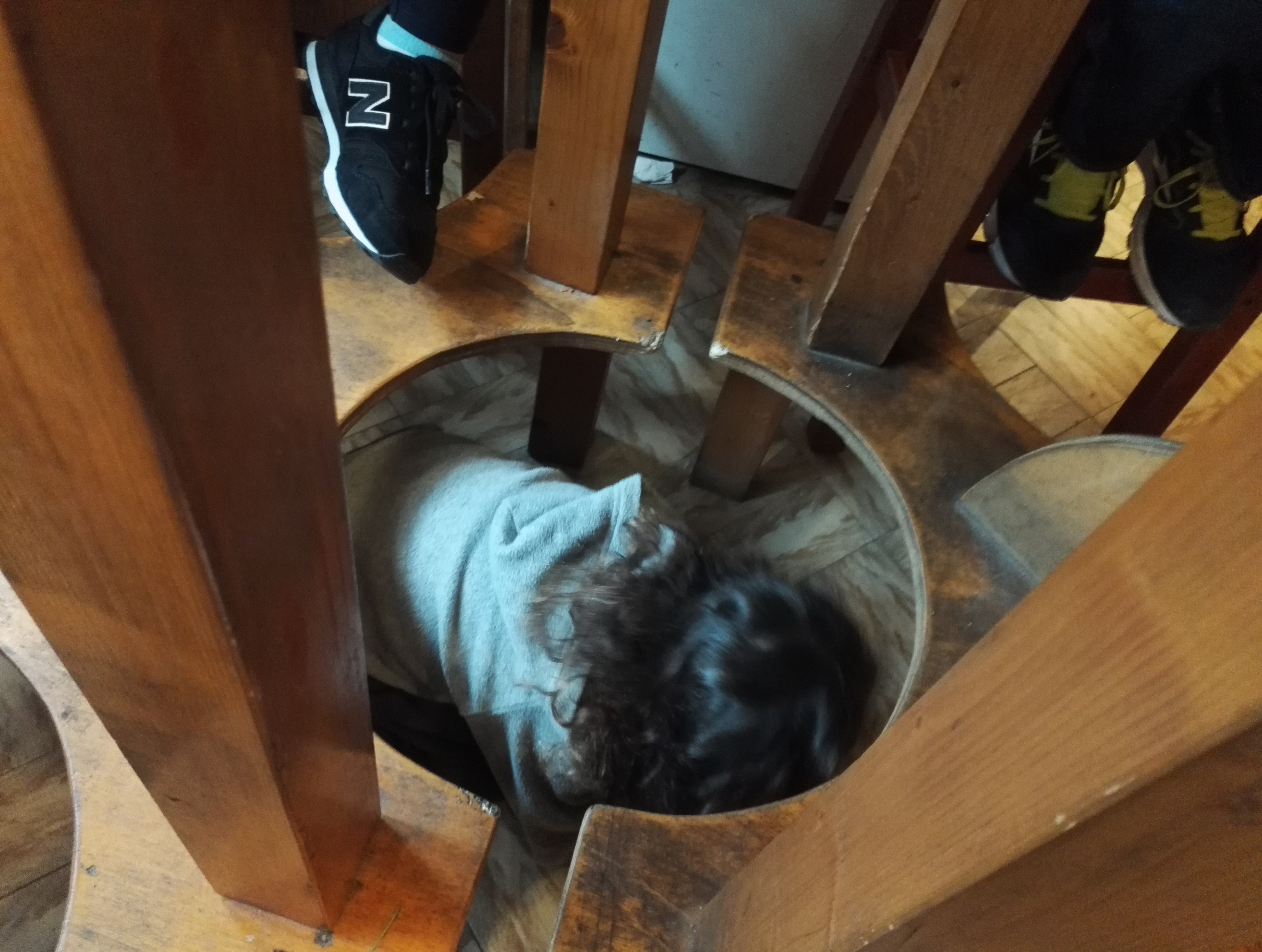 Si è infilato nel buco tra le gambe del tavolo e si è accovacciato, ranicchiandosi tutto.