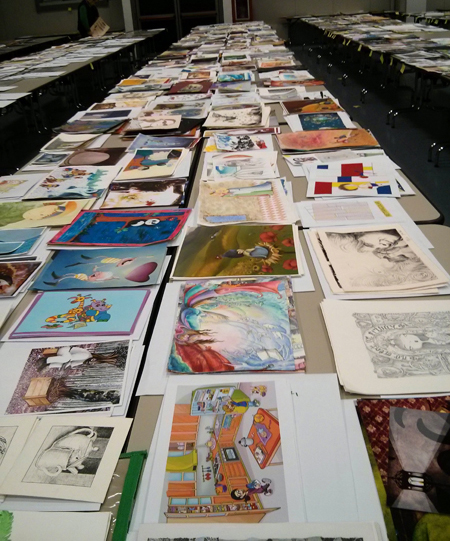 Ecco, finito. Nell’immagine qui sopra siamo in mezzo alla Mostra definitiva, distesa sui due tavoli. Siamo stanchissimi e soddisfatti fino all’ultima cellula.