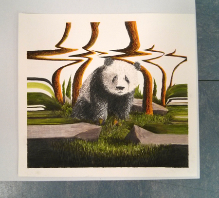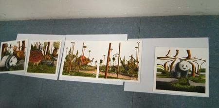 Guardando con più attenzione per capire, ci rendiamo conto che è strana la presenza di un orso panda tra i dinosauri. Cosa ci fa un panda tra i dinosauri? Decidiamo di mettere le tavole in ordine, cerchiamo sul retro i numeri: 1,2,3,4,5. A poco a poco la storia si chiarisce: c’è un orso che si è addormentato. Si sveglia in mezzo ai dinosauri. E’ curioso, li osserva. Ma a un tratto (ultima tavola, quella qui sotto)…