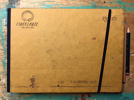 “Studiamo il da farsi, cerchiamo un carnet che sia bello, personalizzato e con una carta che possa dare ampio libertà di scelta sulle tecniche utilizzabili. Troviamo con fortuna l’azienda torinese 13sedicesimi, che realizza taccuini a mano e che crede nella nostra idea. Ci realizza appositamente per il progetto il carnet di 61 pagine bianche numerate con indice, carta con fibre di cotone (matelica gesso 180 g/m2) e copertina in cartone naturale con titolo del progetto inciso. Delizioso!