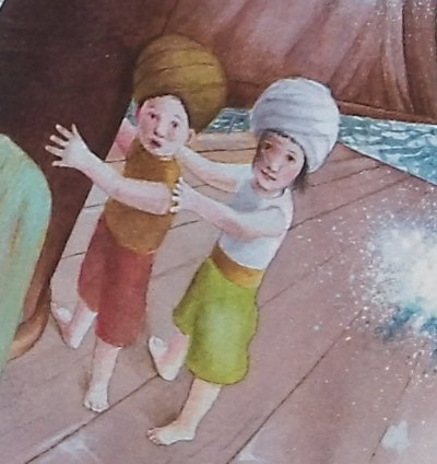 L’immagine qui sopra è ancora nel gruppo dello stile REALISTA (un bambino mi chiese guardando questa immagine: ma sono i fiori che sono giganti o i personaggi che sono piccoli?). Qui però l’illustratrice ha depurato un po’ la realtà dalla sua complessità . Le cose continuano a comportarsi come nella realtà : i personaggi camminano sulla terra con un peso e un baricentro, i fiori gettano ombre, ogni dettaglio è “anatomicamente” corretto. Però… il prato non ha texture (rispetto all’immagine di Sowa), i chiari scuri sono più deboli, le campiture di colore più uniformi. Stiamo scivolando verso il REALISMO DISEGNATO, una sotto-categoria del REALISMO. Le emozioni di questa sotto-categoria sono meno forti, più sfumate, dolci, poetiche, o ironiche.